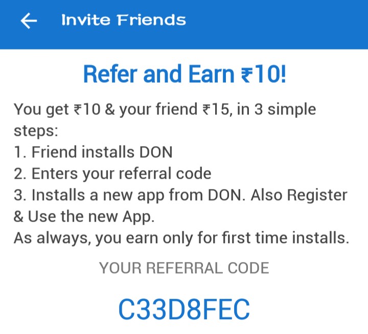 Hi FrNds, Here is another app named DON to earn unlimited recharge by referring your friends. You can earn unlimited recharge using Don app. It gives Rs.2 rupees as daily bonus. Yes this is true. Don is a genuine app you can also earn by downloading apps, daily bonus, completing offers, and also from referrals. You can redeem your earnings to recharge or Paytm transfer