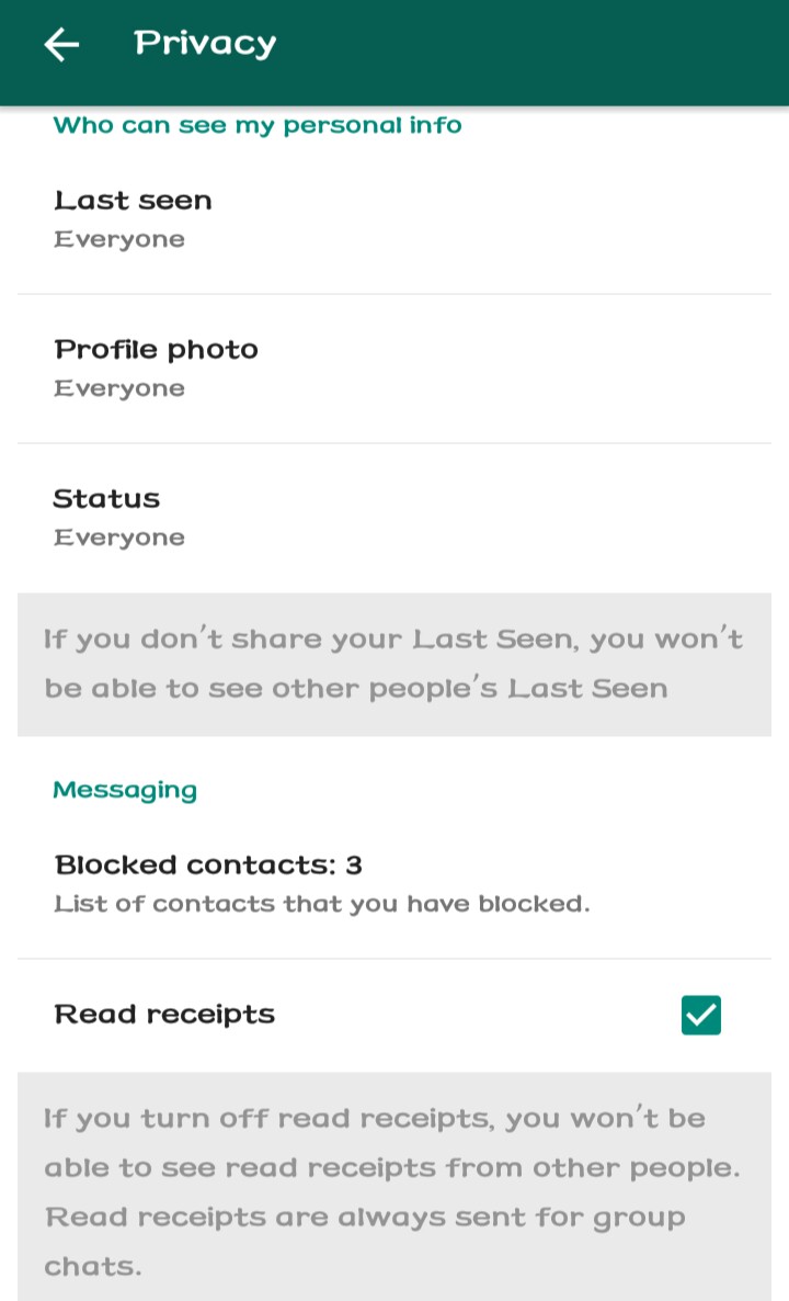 Disabling “Read receipts” option is the probably the easiest method to read a Whatsapp message without notifying the sender. By doing so, you’ll disable the ability of WhatsApp to show blue ticks to the sender that tells them that you’ve read their message. But the downside is that you will not be able to see the double blue check marks when someone has read your message as well. Here’s how to disable it.