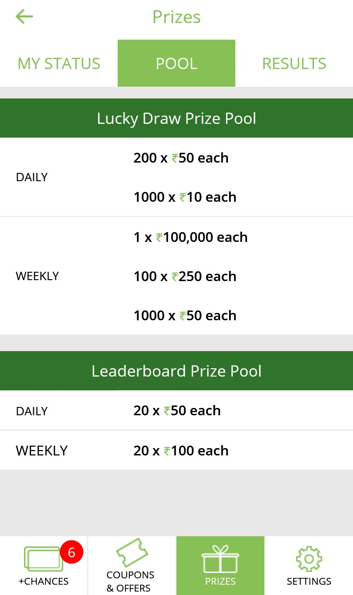 - To Get current leaderboard details, prize pool and winning information go to PRIZE tab